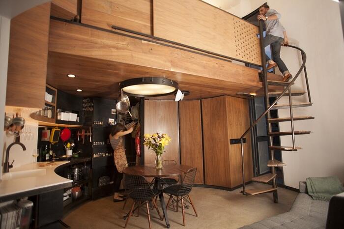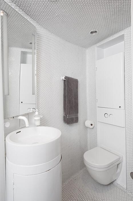 Практично спроектированный интерьер. Площадь Silo House составляет всего 31 кв. метр. Несмотря на такой скромный размер, хозяину удалось расположить все предметы интерьера компактно и практично. Кухня, душ и шкафы для вещей расположены по окружности. Винтовая лестница ведет в уютный спальный лофт, где достаточно места для большой двухспальной кровати.