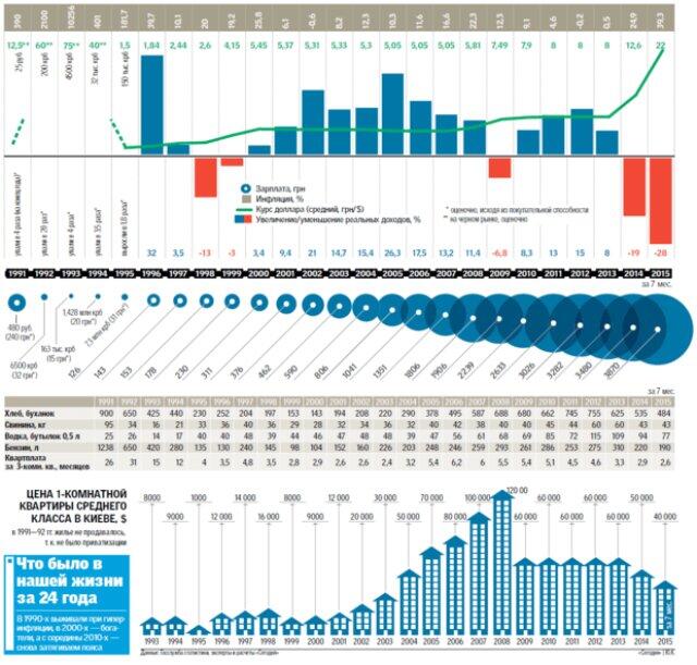 «Самые большие беды пришлось пережить сразу после обретения независимости: в условиях хаоса простые люди очень сильно обнищали, — комментирует цифры президент Украналитцентра Александр Охрименко. — Стабильность наступила только в 1996-м, когда купонокарбованец, обесценившийся из-за гиперинфляции (за пять лет цены выросли более чем в 100 раз!), сменила гривня. Но радость была недолгой: грянул кризис 1998 года, доллар вырос вдвое, инфляция снова стала двузначной. Из кризиса страна вышла лишь в 2001-м — наступил семилетний период сытой стабильной жизни. Экономика развивалась благодаря хорошему спросу на наш основной экспортный товар — металл, пошел в рост агросектор. «Золотыми» можно считать 2005—2006 годы, когда зарплаты резко выросли, а цены — еще нет. Благодаря дешевому доллару, люди начали массово ездить за границу на отдых, покупать импортные товары, квартиры, развивалось кредитование. Но грянул мировой кризис 2008-го, усугубленный ошибками властей, из которого страна с трудом вышла к концу 2013 года. Увы, сейчас страна сейчас в жестком пике, подобном тому, что было в начале 90-х. К сожалению, 2015-й тоже станет «тощим» — из-за инфляции украинцы обеднеют примерно на треть, по сравнению с 2014-м».