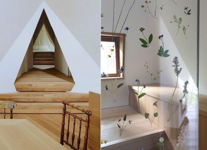 Интерьер. Внутренние помещения выполнены в светлой цветовой гамме. В наивысшей точке высота дома достигает восьми метров, что способствует хорошей циркуляции воздуха. Треугольные окна расположены таким образом, что солнечные лучи могут проникать внутрь дома в течение всего светового дня.