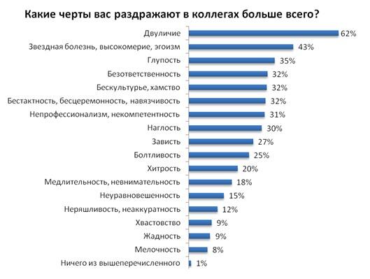 Преобладающее количество негативных отзывов заслужило такое качество у коллег как двуличие – 62% респондентов замечают его и раздражаются. Высокомерие и эгоизм (43%), глупость (35%), безответственность (32%), хамство (32%), бестактность (32%) и непрофессионализм (31%) зачислены в топ черт, раздражающих напарников по работе.
