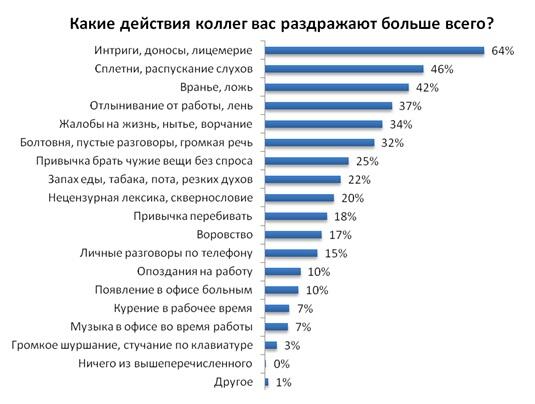 Среди действий, которые выводят из себя и заслуживают возмущения, назывались все то же лицемерие и интригантство (64%), а также распускание слухов (46%), вранье (42%), лень (37%), нытье или ворчание (34%), пустая болтовня (32%).