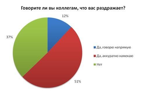 Согласно результатам опроса, проведенного карьерным порталом rabota.ua, лишь 8% респондентов совершенно не знакомо чувство раздражения по отношению к их коллегам. Постоянно нервничают из-за своих коллег 15% опрошенных, а время от времени – 78%.