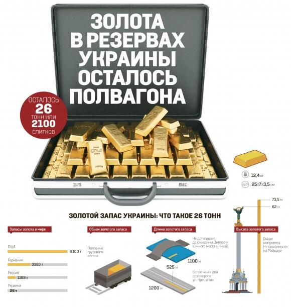 Украина в октябре резко сократила свой золотой запас — на 35%, сообщил в понедельник Нацбанк. Теперь у НБУ не 40,4 тонны благородного металла, а лишь 26,1 тонны. Его доля в общем объеме золотовалютных резервов сократилась с 11,7% до 7,9% (остальное — это ценные бумаги и валюты разных стран: от привычных долларов до евро и фунтов стерлингов). Это намного меньше, чем у развитых стран: например, Португалия хранит в золоте 80% своих золотовалютных резервов, США — 72%, а Германия — 68%. Но в то же время мы не далеко откатились от среднего по миру показателя — доля желтого металла в резервах составляет 11%. Если перевести эти цифры в понятные единицы, то золота у нас примерно осталось полвагона или же им можно выложить меньше половины Крещатика (см. инфографику).