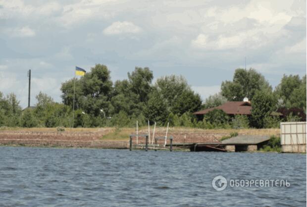 Рядом установлен флагшток, на котором развевается национальный флаг, вдали "прячутся" несколько зданий. Участок, который в кадастровой карте указан как "для обслуживания объектов рекреационного назначения", то есть зон отдыха, принадлежит, по словам соседей, бывшему народному депутату Украины III и IV созывов Александру Волкову, который является страстным поклонником рыбной ловли.