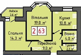 Двокімнатне планування квартири 63 м² в ЖК Волошковий дім, с. Липини